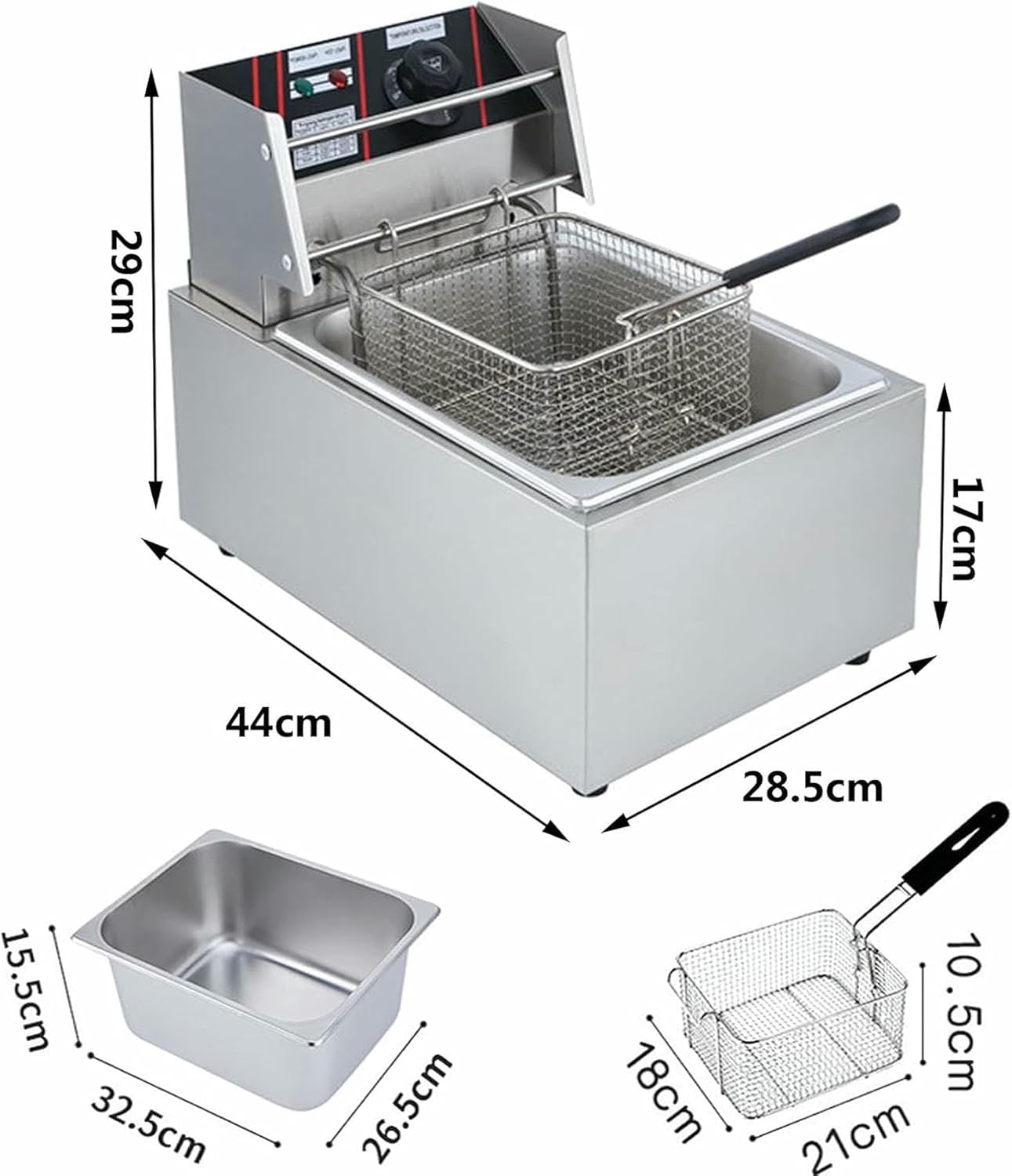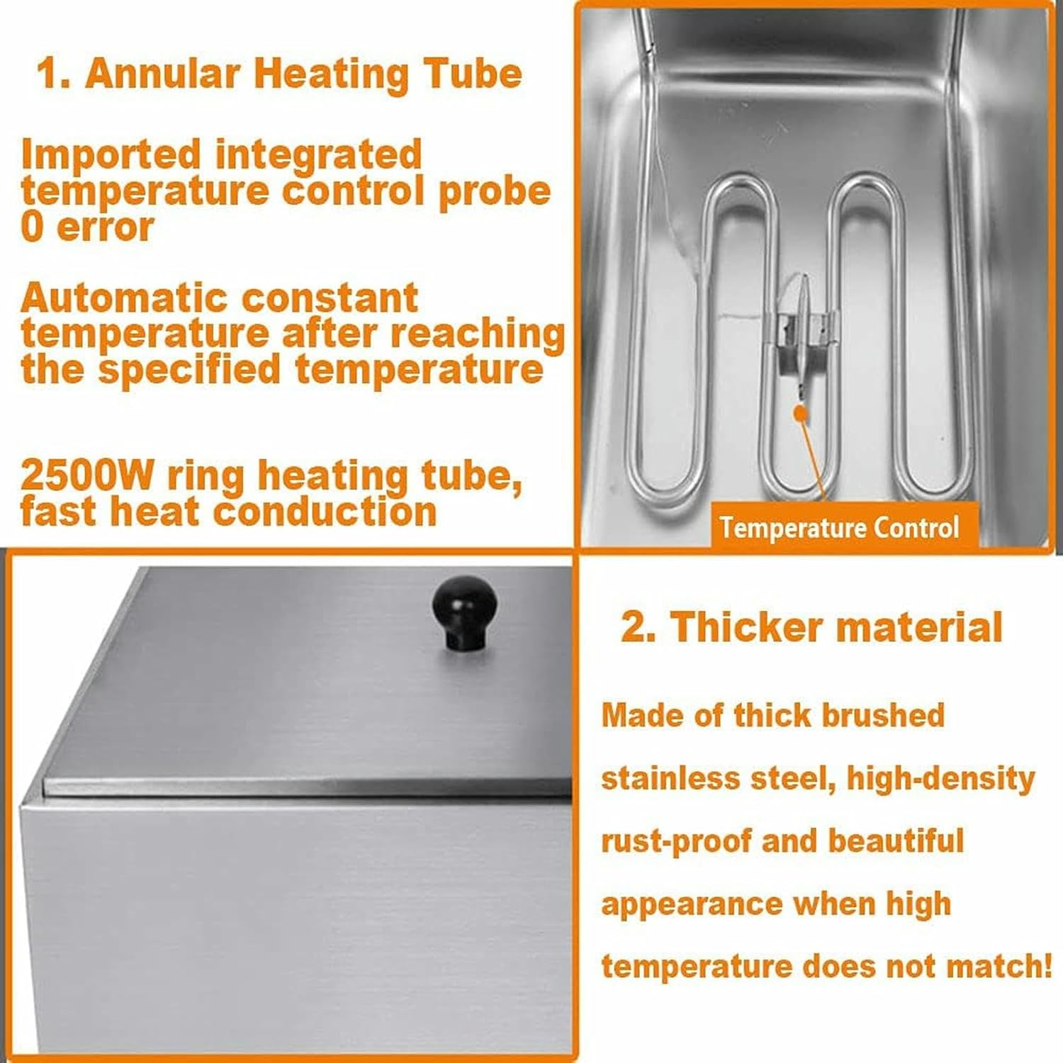 Product Description: Our stainless steel deep fryer, with a removable oil container and non-stick pan, makes the fryer very fast and easy to clean, easy to hold, and has a cool touch handle to make the fryer safer. Very suitable for home and commercial use, very suitable for French fries, fish, chicken nuggets, etc.Specification:Material: Stainless steel Power: 2500W Product size: 430 * 280 * 300mm (16.9 x 12") Tank capacity: 5.5L Temperature range: 60~200°C Weight: 10.4lbs / 4.7kgPackage containsStainless steel fryer x1 Stainless steel fryer basket x1 Stainless steel cap x1 Stainless steel separator x1 Instruction manual x1